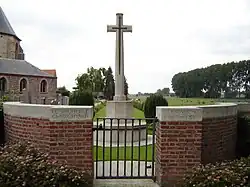 The village used to have a castle that was built around 1100. On September 6, 1793 the fortified castle was completely burnt down, on the orders of Napoleon's General Van Damme. A double railway was constructed where the castle stood (now a meadow) during the First World War. Reningelst was a stopover for many soldiers on their way to or from the front. After the war, several military cemeteries were built across the Westhoek, as well as in Reningelst. There is the Grootebeek British Cemetery, the Reninghelst Churchyard Cemetery next to the civil cemetery around the church. The Reninghelst New Military Cemetery includes those from the Chinese Labour Corps. There is also a Memorial for the military and civilian victims of World War I and World War II from Reningelst.
