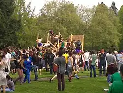 Renn Fayre is an annual three-day celebration that occurs on the campus of Reed College in Portland, Oregon. The festival was originally a one-day Renaissance Fayre, held during the spring semester for the purpose of recreating the Renaissance era.[1] On the final days of class instruction, seniors march from the library to the registrar's office to celebrate the completion of their theses and to receive congratulations from the institution's President.[1] The parade of students begins a weekend festival that has featured a variety of activities and forms of expression, including a fire show, fireworks, food, a giant slide and skate ramp, handicraft, lube wrestling, nude students covered by blue paint known as "Picts", Glow Opera, and other sports.[1][2]