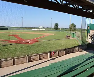 Renner Ball Park is one of the oldest still-standing original baseball fields in the United States.[2] In the 1950s, several renovations were carried out to repair flood damage; the field was elevated and resurfaced, and the dugouts were raised to prevent rainwater accumulation. A 1963 storm destroyed the grandstand's roof and a new one was installed. The original concession stand was replaced with a new one in 1996. The field is surrounded by a chain-link fence on most sides; a wooden fence surrounds the outfield.[2] A new scoreboard replaced the old one in the outfield in 2021.[3]