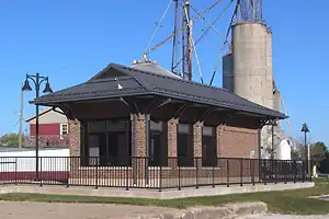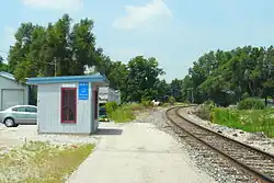 A small shelter at Rensselaer was built in 1981 and maintained by the local Lions Club.[1][4] The former Monon Railroad station was demolished in 1981, and preceding this station was a two-story wooden depot built in 1900. Some of the brick pavement and red tile flooring from the second station is still visible today.[5]