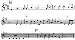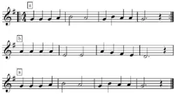 Types of repetition include "exact repetition" (aaa), "repetition after digression" (aba or aba'), and "nonrepetition" (abcd). Copland and Slatkin offer "Au clair de la lune" and "Ach! du lieber Augustin" ⓘ as examples of aba, and "The Seeds of Love" as an example of the last.(Copland & Slatkin, [unpaginated])