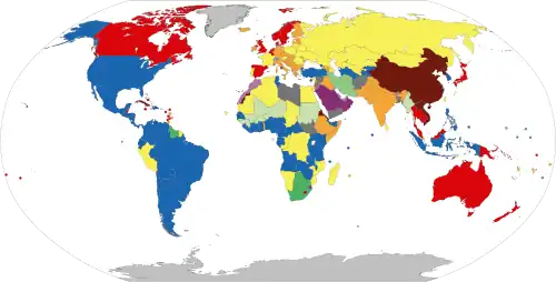 - ^ The Republic of Turkey is counted amongst Europe, the Russian Federation as a single republic, the Republic of Kosovo (recognised by most other European states) as an independent republic, Vatican City as an elective monarchy. The Republic of Kazakhstan is not shown on this map and is excluded from the count. The Turkish Republic of Northern Cyprus (recognised only by Turkey) and all other unrecognised states are excluded from the count.
