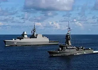 The lead ship of the class, RSS Formidable was built overseas in Lorient, France and commissioned locally on 5 May 2007, marking the 40th anniversary of the RSN.[98] The final two ships, RSS Stalwart and RSS Supreme were commissioned on 16 January 2009.[99] The six frigates form the First Flotilla of the RSN.