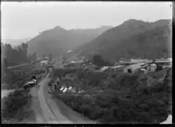 The first European settlers arrived in 1895, with the town proper established two years later.[5] Growth of the town was seriously affected by the deaths of 51 men (including some from the smaller nearby settlements of Kohuratahi and Tahora)[6] in the First World War and a major flood in 1924.[5] The town recovered with arrival of the railway line in 1933 and electrification in 1959, but its population declined in subsequent decades.[5] The school closed in 1979, followed nine years later by the post office.[5]