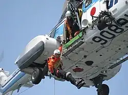 In the JMSDF, helicopter rescue swimmers (HRS) are selected from assistant nurses and trained as both aircrew and divers.[9] In contrast, paramedics (救難員, kyūnan-in) of the JASDF, Japanese counterparts of the United States Air Force Pararescue, are not always medical professionals, but they must complete the Airborne Ranger Course of the Japan Ground Self-Defense Force to acquire mountain rescue and combat search and rescue capabilities.[10]