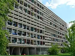 At the 1925 International Exhibition of Modern Decorative and Industrial Arts in Paris, Le Corbusier designed the "Esprit Nouveau" pavilion. The pavilion included a full-scale residential unit of a multi-story apartment building—an experimental two-level apartment.[3] Le Corbusier later used a similar unit in the late 1940s for his Unité d'Habitation in Marseille.[4][5] Also called The Marseille block (1947–1952) is a large multi-unit residential building situated on a spacious green plot. For this project, Le Corbusier used standardized duplex apartments with balconies facing both sides of the building. Inside, at its mid-height, was a communal service complex: a cafeteria, library, post office, grocery stores, and more. The balconies' enclosing walls were painted in bright primary colors—polychromy—on an unprecedented scale. Similar Unités d’Habitation (with some modifications) were later built in cities such as Nantes-Rezé (1955), Meaux (1960), Briey-en-Forêt (1961), Firminy (1968) in France, and in West Berlin (1957). These structures embodied Le Corbusier's concept of the "Radiant City"—a city designed for human well-being.[6]