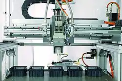 A casting system can be combined with many different production steps within a production line. So casting becomes an integrated part of the whole manufacturing of a part. To account for the delicate requirements of dispensing in all production steps in the best way, the most significant manufacturers are active in automation as well. The newest development in this area is the design of a production line from prefabricated, ideally adapted modules and robotics.[3] This speeds up the development of individual solutions and decreases their costs.