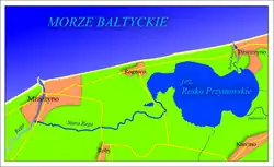 Resko Przymorskie (German: Kamper See) is a coastal lake of the Baltic Sea on the Trzebiatów Coast, located in the West Pomeranian Voivodeship, within the gminas of Trzebiatów and Kołobrzeg. The surface area of the water body varies, according to various sources, from 55.39 square kilometers to even 66.86 square kilometers.