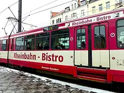 - The U76/U70 tram line between the German cities of Düsseldorf and Krefeld used to offer a Bistrowagen ("dining car" in German), where passengers could order drinks and snacks. That practice dates back to 1924, when interurban trams conveyed a dining car.[6] With the introduction of modern tram units in 1981, four trams had a Bistrowagen[7] that operated every weekday until 2014.