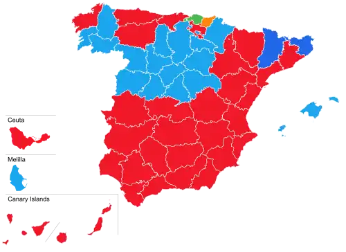 348 members of the Congress of Deputies were elected using the D'Hondt method and a closed list proportional representation, with an electoral threshold of three percent of valid votes—which included blank ballots—being applied in each constituency. Seats were allocated to constituencies, corresponding to the provinces of Spain, with each being allocated an initial minimum of two seats and the remaining 248 being distributed in proportion to their populations. Ceuta and Melilla were allocated the two remaining seats, which were elected using plurality voting.[2][3] The use of the electoral method resulted in an effective threshold based on the district magnitude and the distribution of votes among candidacies.[4]