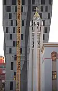 The bell tower, designed and sculpted by Archbishop Anastasios, is composed of four Paschal candles which symbolize the four Evangelists who proclaimed the Resurrection. These join around the central shaft of stairs. The winding staircase leads to two open floors with 16 bells. A four-sided clock sits above the bells. The two underground levels below the cathedral church were used to fulfill the church's need for a Cultural and Conference Center. The center has an amphitheater with a capacity for 500-850 people which may be used to host lectures, shows, and concerts. The auxiliary wings and backstage allow this hall to be used as a theater also.