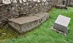 Violent mobs were not the only problems body snatchers faced. Naples also wrote of how he met "patrols" and how "dogs flew at us",[42] references to some of the measures taken to secure graves against his ilk. The aristocracy and very rich placed their dead in triple coffins, vaults and private chapels, sometimes guarded by servants. For the less wealthy, double coffins were available, buried on private land in deep graves. More basic defences included the placing of heavy weights over the coffin, or simply filling the grave with stones rather than soil. Such deterrents were sometimes deployed in vain; at least one London graveyard was owned by an anatomist who, it was reported, "obtained a famous supply [of cadavers] ... and he could charge pretty handsomely for burying a body there, and afterwards get from his pupils from eight to twelve guineas for taking it up again!"[43] Ever more elaborate creations included The Patent Coffin, an iron contraption with concealed springs to prevent any levering of its lid. Corpses were sometimes secured inside their caskets by iron straps, while other designs used special screws to reinforce metal bands placed around the coffin.[44][45] In Scotland, iron cages called mortsafes either encased buried coffins, or were set in a concrete foundation and covered the whole grave.[g] Some covered more than one coffin, while others took the form of iron lattices fixed beneath large stone slabs, buried with the coffin.[44][45] They may not have been secure enough; as one 20th-century writer observed, an empty coffin found beneath a buried mortsafe in Aberlour had probably been "opened during the night succeeding the funeral, and carefully closed again, so that the disturbance of the soil had escaped notice or had been attributed to the original burial."[47]