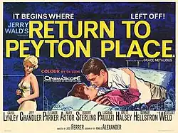 Return to Peyton Place is a 1961 American drama film in color by De Luxe and CinemaScope, produced by Jerry Wald, directed by José Ferrer, and starring Carol Lynley, Tuesday Weld, Jeff Chandler, Eleanor Parker, Mary Astor, and Robert Sterling. The screenplay by Ronald Alexander is based on the 1959 novel Return to Peyton Place by Grace Metalious. The film was distributed by 20th Century Fox and is a sequel to their earlier film Peyton Place (1957).