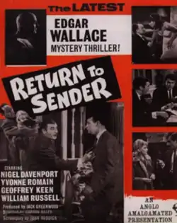 Return to Sender is a 1963 British drama directed and edited by Gordon Hales and starring Nigel Davenport, Yvonne Romain and Geoffrey Keen.[1][2] It was made at Merton Park Studios as part of the long-running series of Edgar Wallace adaptations.[3][4]