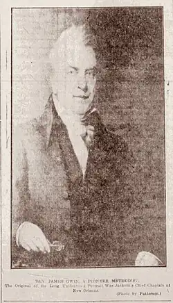 Rev. James Gwin (January 10, 1769 – August 3, 1841) was an American frontier soldier and Methodist camp-meeting preacher who worked throughout the west, originally in Tennessee and Kentucky, then in Missouri and Illinois, finally retiring to Mississippi to be closer to his sons. In 1843 he was described as "the Indian fighter, and war chaplain to chieftain [Andrew] Jackson—one of the best Christians in the world, but believing it to be a religious duty never to forgive an enemy until he had first given him a sound thrashing—who believed both in prayer and battle—the battle first and the prayer afterwards."[1] One of Gwin's sons, William McKendree Gwin, became one of the first U.S. Senators from California. Another son, Samuel Gwin, died from wounds received in a duel in Mississippi over an appointment made by Jackson to a U.S. government land office. The last letter Jackson ever wrote was addressed to W. K. Gwin; Jackson expressed his deep fondness for Gwin as well as his regard for Gwin's "venerated father and brother."[2]