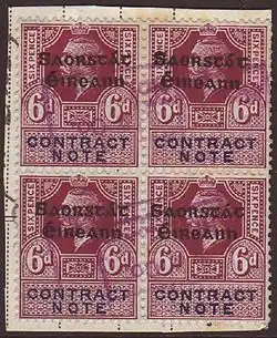 The Irish Free State (Irish: Saorstát Éireann) was established at the end of 1922, and British or Irish revenues were once again similarly overprinted. Saorstát overprints may be found on Contract Note, County Courts, Dog Licence Registration, Estate Duty, Excise, Foreign Bill, Judicature, Land Commission, Land Registry, National Health Insurance, Petty Sessions, Public Records, Registration of Deeds and Unemployment Insurance stamps.[3]