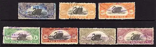 In 1941, a new set was issued inscribed REVENUE DUTY W.A. This also showed the swan, but the design was now smaller. Initially five values from 1d to 1/- were issued, but new values continued to be issued, the highest being the £10 in 1951 and in 1963. This set remained in use until the Australian dollar was adopted in 1966. From that year until 1973, a large set of sixteen values from 1c to $50 was issued. Each value had a different wildlife design.