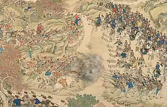 ![]() Khoja rebels and Qing soldiers fighting at the Battle of Yesil-kol-nor near Yashilkul Lake, 1759. Painted by Jean-Damascène Sallusti in 1764. | |||||||
