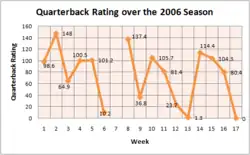 During the 2006 season, Grossman became the first Bears quarterback to start all sixteen games since Erik Kramer in 1995.[33] In a season dubbed as a "roller coaster ride" by Grossman himself, the fourth-year quarterback had several productive performances, which were seemingly diluted by a handful of turnover-ridden games, especially in Week 6 against the Arizona Cardinals, where Grossman fumbled twice and threw four interceptions.[34] While earning a passer rating of at least 100 in seven games, he earned a sub 50 rating in five games during the latter portion of the season. Grossman, who was recognized as the NFC Offensive Player of the Month in September, concluded the season's final month with a 64.4 passer rating, including a zero rating during the season's finale game against the Green Bay Packers.[35][36] Grossman's work ethic drew criticism when he admitted that he was not adequately prepared to play and later claimed the game to be "meaningless."[37] He later clarified his statement days later and claimed his quote was taken out of context.[38] His inconsistent performance drew criticism, and calls for Smith to bench Grossman in favor of the veteran Brian Griese.[39]