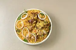 Old Dhaka boasts a variation of the famous pilaf - the Morog Polao - in which the rice is cooked after and the chicken pieces are cut. Other polaos include ilish polao and rui polao. Dhakaiyas are noted for introducing paneer and boiled eggs to khichuri.[19] Dhakai bakarkhani is a thick, biscuit-like flat-bread which is a traditional street-food snack, famed for its quality and taste. It is mainly dished up with tea.[22][23] Dhakaiyas proudly hold a heritage of creating the best khili paan using various herbs and spices. They also offer a khili paan for diabetic patients called the "paan afsana".[24] Haji biryani is a dish, invented by a restaurateur in 1939, made with highly seasoned rice, goat's meat and number of spices and nuts. The restaurant has become an integral part of Dhakaiya culture.[25]