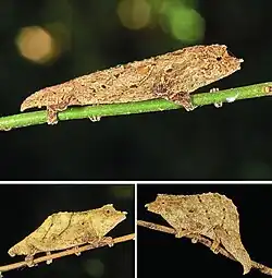Rhampholeon (from Greek: ῥάμφος rhamphos, 'bird's bill' and Greek: λέον leōn, 'lion')[1] is a genus of small chameleons, commonly known as pygmy chameleons or African leaf chameleons, found in East Africa and Central Africa. They are found in forests, woodlands, thickets, and savanna, and most species are restricted to highlands. They are brown, grey, or green, and typically seen at low levels in bushes, or on the ground among grasses or leaf litter.