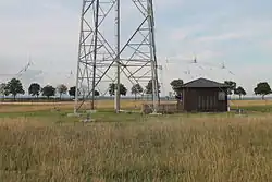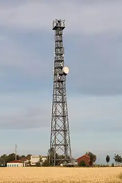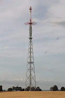 Furthermore, there is a 114-metre-tall guyed steel tube mast, which is also insulated against ground. This mast, which is used as reserve antenna for medium wave broadcasting, has an FM-transmission antenna on its top. Furthermore, there is also a free-standing grounded lattice tower used for radio services in UHF/VHF-ranges.