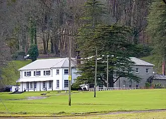 The park is designated Grade II on the Cadw/ICOMOS Register of Parks and Gardens of Special Historic Interest in Wales.[13] The grounds by 1899 included orchard, woodland with vista paths, parkland, greenhouses, conservatory, carriage drive, kitchen garden, and pheasantry.[14] Rheola Pond lies just north of the house, with an ice house close by, which was probably built at the same time as the main house.[15] Nash Edwards-Vaughan added several other features to the parkland. A chapel (later demolished) had been built, overlooking the lake,[6] and substantial ornamental tree planting in the park from the period still survives.[16]