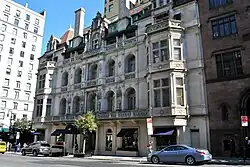 The primary elevation of the facade faces Madison Avenue and is divided vertically into three parts: a central section flanked by projecting pavilions at either end.[13][19] In the center of the ground (first) floor was the original main entrance.[19] The ground story originally had decorations and an iron fence, but these were removed in the 20th century, when the house became a commercial building. The round-arched doorways at ground level were originally windows, while the other ground-floor openings were enlarged into storefront windows.[20] The ground floor contains storefront windows, round archways, and smooth walls.[19] There is an entrance at the corner of Madison Avenue and 72nd Street, which was added in a 1980s renovation.[21]