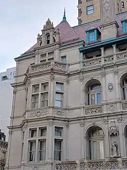 The mansion has a limestone facade.[13][14] Among the decorative details are ornamental carvings and round-arched windows in the French Renaissance style,[13] which are concentrated on the upper stories.[17] The roof is red and contains a copper cresting, as well as various dormers and finials.[13][14][18]