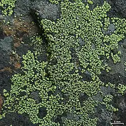 Rhizocarpon macrosporum (lemon map lichen) is a smooth, bright yellow crustose aereolate lichen found in the Sonoran Desert of California and Arizona, and in Africa and Asia.[1] It grows on non-calciferous rock in clearings in coniferous forests, from 1,475 to 3,030 metres (4,839 to 9,941 ft).[1]