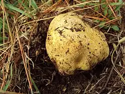 Their fruiting bodies (basidiocarps) are truffle-like and 1–4 centimetres (1⁄2–1+1⁄2 in) in diameter when dried, with a yellow 60–240 μm-thick peridium and pale yellow gleba.[5][2] These structures stain reddish with injury[6] Their basidia are clavate and contain 6 or 8 spores.[7] The spores are smooth, ellipsoidal and 7–9 by 3–5 um.[2] They have white hyphae 2–5 mm in width and 5–25 um in length with simple dichotomous branching and thick rhizomorphs.[8] They lack clamp connections and deposits of what is thought to be calcium oxalate found on the mantles of some other members of their genus.[7][9]