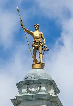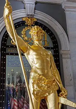 On top of the dome stands a gold-covered bronze statue of a male figure known as The Independent Man. The statue, originally named Hope, was designed by George Brewster, cast by the Gorham Manufacturing Company,[6] and installed in 1899.[7] The statue weighs more than 500 pounds (230 kg), is 11 feet (3.4 m) tall, and stands 278 feet (85 m) above the ground.[8] The Independent Man represents freedom and independence and alludes to the independent spirit which led Roger Williams to settle and establish Providence Plantations and later the Colony of Rhode Island and Providence Plantations.