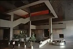 The tower's interior has frequently been used for art exhibits. These include the Young People's Art Exhibit, sponsored by the Ohio Art Education Association in 2001.[30] An Ohio Art League exhibition in 1992 prompted complaints from the building's tenants. Some of the pieces impeded hallways;[31] other works in the exhibit received complaints due to nudity or their statements on sexism and reproductive rights.[32] It was reported in 1973 that tower would feature its own commissioned artwork, at a cost of $300,000 to $400,000, including graphics, sculptures, and tapestries with themes of Ohio history, culture, geography, and resources.[33] In 1974, a proposal aimed for $1,175,000 for paintings, gardens, sculptures, and other artworks, including a rooftop garden and sculpture;[34] $800,000 was estimated to have been spent on the program in June 1974.[35]