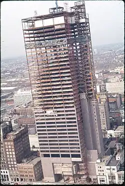 Construction necessitated demolition of the Columbus Board of Trade Building (at the same address), the Outlook Building, and the Spahr Building. In 1971, the site was clear, allowing for construction,[7] which began on May 4, 1971. There was no groundbreaking ceremony, reportedly because the governor declined to participate.[49][50] The building was topped out in October 1972. The first agency to move in was the Department of Administrative Services (DAS), in January 1974. Construction lasted until mid-1974; in the meantime, the DAS worked on the logistics of moving in other agencies. Late in construction, the state decided to reduce the building's height from 42-43 stories to 41; costs rose from the $40 million expected up to $66 million[11] or $80 million.[51]