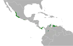 The distribution in Central America and northern South America includes Mexico, Costa Rica, northern Venezuela and northern Colombia. Typical habitat is thick undergrowth in deciduous forests, secondary woodland, thickets and scrubland. It most frequently occurs in the mountain foothills at altitudes varying between 500 and 1,500 m (1,600 and 4,900 ft).[4]