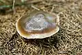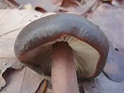 The cap is 2 to 10 centimetres (3⁄4 to 4 in) across. It is convex and becomes broadly convex or almost flat. When fresh, this species is smooth and moist. It has a reddish-brown colour fading to cinnamon.[5]