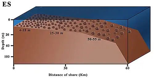 Rhodolith beds have been found throughout the world's oceans, including in the Arctic near Greenland, in waters off British Columbia, Canada, the Gulf of California, Mexico,[7] the Mediterranean [8] as off New Zealand[9] and eastern Australia.[10] Globally, rhodoliths fill an important niche in the marine ecosystem, serving as a transition habitat between rocky areas and barren, sandy areas. Rhodoliths provide a stable and three-dimensional habitat onto and into which a wide variety of species can attach, including other algae, commercial species such as clams and scallops, and true corals.[4] Rhodoliths are resilient to a variety of environmental disturbances, but can be severely impacted by harvesting of commercial species. For these reasons, rhodolith beds deserve specific actions for monitoring and conservation.[11][12][13][14] Rhodoliths come in many shapes, including laminar, branching and columnar growth forms.[15] In shallow water and high-energy environments, rhodoliths are typically mounded, thick or unbranched; branching is also rarer in deeper water, and most profuse in tropical, mid-depth waters.[1]
