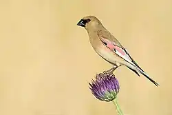 The desert finch (Rhodospiza obsoleta), sometimes called Lichtenstein's desert finch, is a large brown true finch found in southern Eurasia. Its taxonomy is confused, and it has formerly been placed in Fringilla, Bucanetes, Carduelis and Rhodopechys.