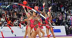 Organizers of Grand Prix events are also allowed to hold extra events for groups in the same venue. In the early editions, the group competitions were staged as parallel events (usually in the form of international tournaments) that were intertwined with individual performances during the Grand Prix competitions. In 2003, an official Grand Prix event especially for groups was held in Sofia, Bulgaria.[7] Since 2016, organizers can also organize a group competition, although they are not required to do so.[2] Nations which have earned at least one group medal on senior level, either in international tournaments or official Grand Prix stages, since 1995, include: