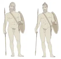 There is no clear testimony in ancient literature to identify the athletes or heroes depicted by the bronzes. It seems that the two nudes originally formed part of a votive group in a large sanctuary. It is conjectured that the bronze sculptures may represent Tydeus and Amphiaraus respectively, two of the warriors from the Seven against Thebes monumental group in the polis of Argos, as Pausanias noted.[15]