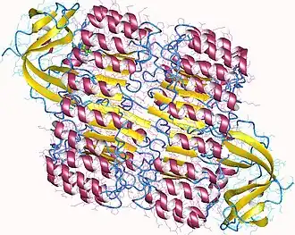 ![]() Top view of porcine ribonuclease inhibitor, showing its horseshoe shape.[1] The outer layer is composed of α-helices and the inner layer of parallel β-strands. The inner and outer diameters are roughly 2.1 nm and 6.7 nm, respectively. | |||||||||||