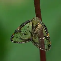 Ricaniidae is a family of planthopper insects, containing over 400 species worldwide. The highest diversity is in tropical Africa and Asia and in Australia, with a few species occurring in the Palearctic and Neotropical realms. It is one of the smaller families in the planthopper superfamily Fulgoroidea.[1]