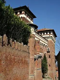 In 1910 Gualino bought a controlling interest from Baron Armin von Popper in the Forst Union, an indebted company that had various forest properties in the Habsburg Empire and Romania and had a key role in the Austrian forest products export cartel. Gualino hoped to use this position to obtain a discount on the cartel's exorbitant prices but had little success.[2] That year Gualino and his wife launched the construction of a castle with almost 150 rooms in Cereseto, a small village near Casale Monferrato.[3] The Castello di Cereseto, in Neo-Quattrocento Piemont-Lombardy style, was completed in 1913.[4]