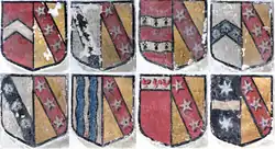On the cornice of the monument to Richard Bampfield in Poltimore Church, are displayed 8 painted escutcheons depicting the arms of 5 of his sons-in-law, each impaling Bampfield, and 3 sons-in-law of his son and heir Sir Amias Bampfylde, each impaling Bampfield. Left to right on cornice: