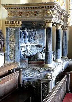 Richard Bampfield's monument, erected in 1604 by his son Amias Bampfield, survives in the south transept of Poltimore Church. It comprises two recumbent stone effigies, of Richard Bampfield and his wife, under a low canopy supported by arched openings and columns.[16] A view of the monument is obstructed by pews in front and by the balcony above forming the manorial pew of the Bampfield family. The 8 painted escutcheons on the cornice depict the arms of 5 of his 8 sons-in-law, each impaling Bampfield, and the 3 sons-in-law of his son and heir Sir Amias Bampfylde, each impaling Bampfield.