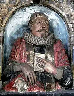 Beaple died on 30 December 1643, aged 79. In his will he left £420 to benefit four poor people resident in Penrose's Almshouses.[14] On one side of his monument in St Peter's Church is a small depiction of these almshouses with a group of four poor inmates. It matches one on the other side depicting a merchant pointing to a treasure chest with three sailing ships on the sea behind.