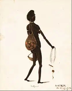 Richard Browne's most characteristic work is from to the emancipist part of his life between 1817 and 1821. His illustrations from this period focus on the Indigenous peoples of the Sydney area. Several of these are included in A collection of portraits, predominantly of Aborigines of New South Wales and Tasmania, ca. 1817–1849.[2] In these illustrations Browne employed a more exaggerated caricature style which owed much to the silhouette portrait tradition.[4] These illustrations were often sold as souvenirs in Sydney and appear to have reflected the demand of the time.