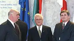 ![]() Cachia Caruana (right) at the signing ceremony for the 2003 Treaty of Accession in Athens, pictured with Eddie Fenech Adami (centre) and then-Minister of Foreign Affairs Joe Borg (left) | |