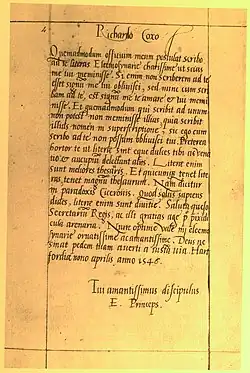 He was educated at the Benedictine Snelshall Priory near Whaddon, at Eton, and at King's College, Cambridge, where he graduated B.A. in 1524.[1] At Cardinal Wolsey's invitation he became a member of the Cardinal's new foundation at Oxford, was incorporated B.A. in 1525, and created M.A. in 1526.[2] In 1530 he was engaged in persuading the more unruly members of the university to approve of the King's divorce.
