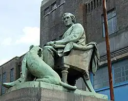 A statue by Edward William Wyon (1811โ1885), of Green stands outside the Poplar Baths, his face modeled from his death mask; with him is his faithful Newfoundland dog "Hector". The dog famously lost its ear in 1967 when a young boy got stuck climbing the statue, and the Fire Services had to cut him away. On the side of the statue there are two Bas reliefs, to commemorate his shipbuilding exploits; on one side is the Arapiles which was still under construction in his shipyard on his death, and on the other side the record-breaking Clipper Challenger which he built in 1852 to challenge American rivals in the tea trade.[2]